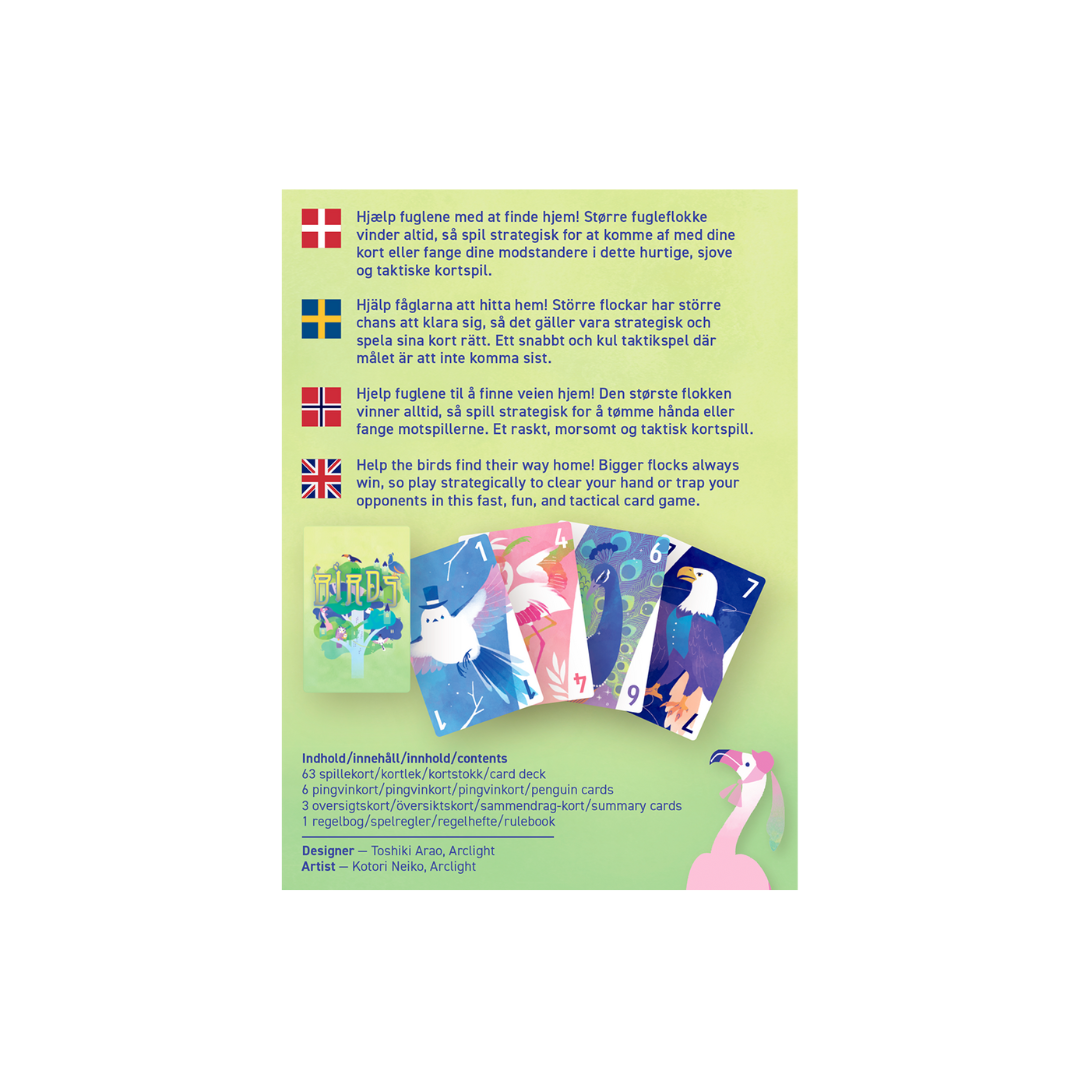Birds spilles i runder, hvor målet er at komme af med sine kort. Den sidste spiller med kort på hånden mister en pingvinbrik, og når en spiller løber tør for pingviner, er vedkommende ude.