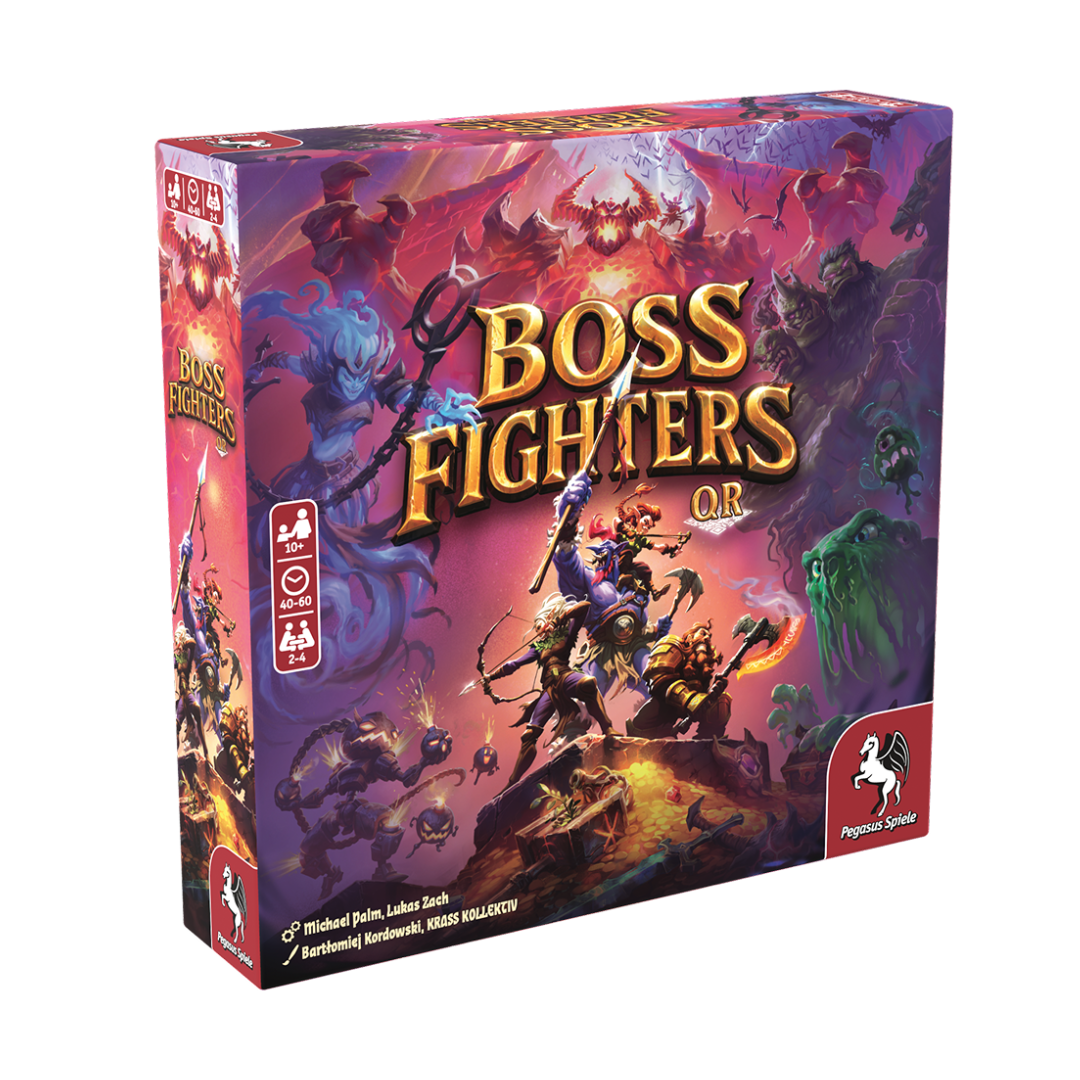 Tag på dristige eventyr med 2–4 helte, når I står over for ti unikke og intelligente boss-monstre! Det særlige ved Boss Fighters QR er, at alle bosser styres af en app, som dynamisk reagerer på jeres handlinger. I starten af hver kamp er bossernes taktikker og evner et mysterium – kun gennem observation og strategi kan I afsløre deres svagheder, besejre dem og få adgang til kraftfulde byttékort til at opgradere jeres decks og låse nye evner op.