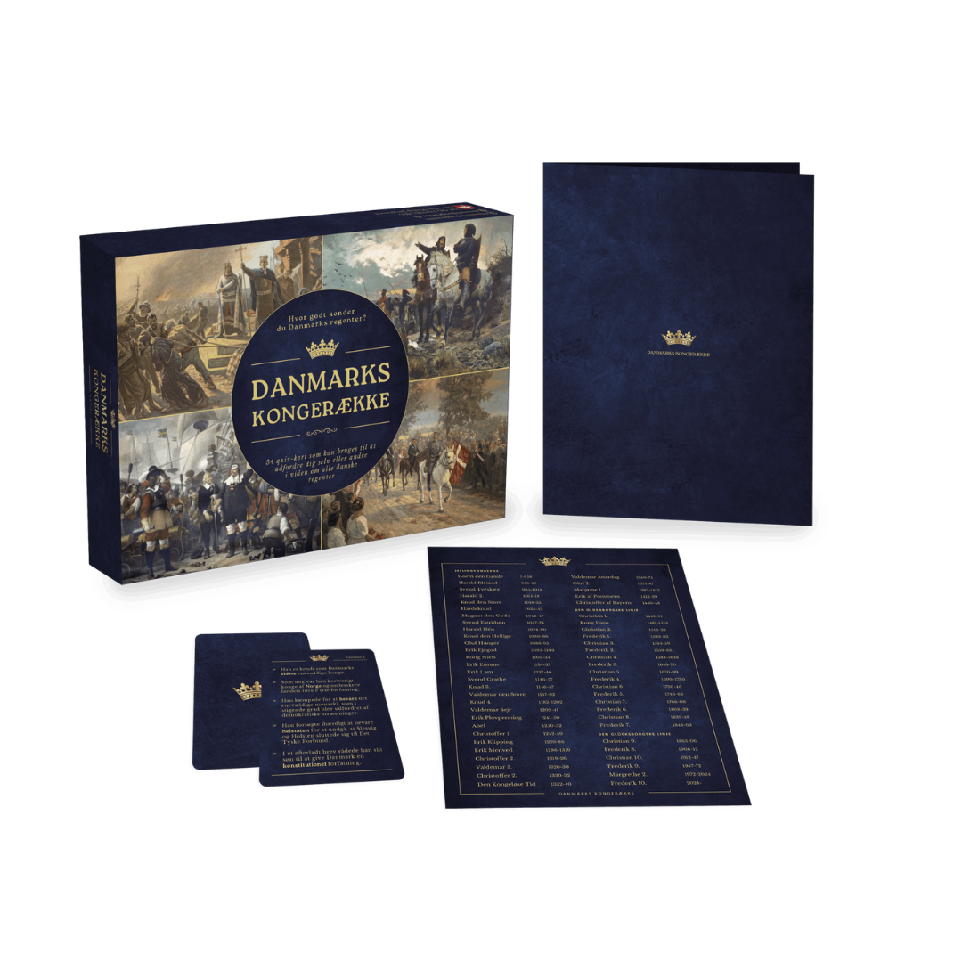 Med vores quiz-spil kan både børn og voksne udforske kongerækken på en sjov og lærerig måde. Hvert kort indeholder fem ledetråde, der fortæller noget unikt om en dansk regent. Det gælder om at være både taktisk, hurtig og klog, hvis du vil gætte, hvem der gemmer sig på kortet, før dine modstandere gør. Spillet giver mange timers underholdning og læring – fra Gorm den Gamle til Frederik 10.