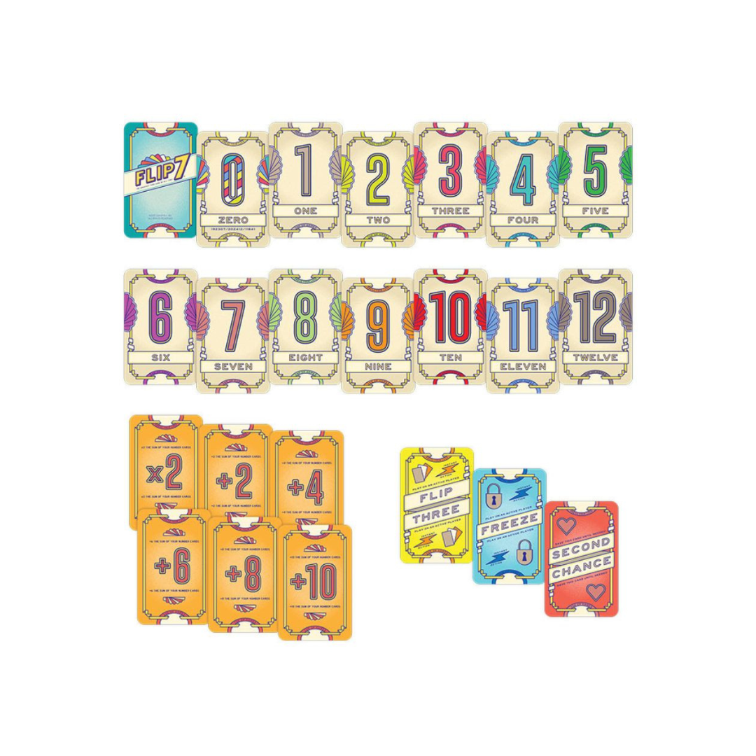 Flip 7 er et nervepirrende og vanedannende kortspil, hvor målet er at vende ét kort ad gangen uden at ramme det samme tal to gange. Lyder det nemt? Tro om igen – bunken er opbygget med ét 1-tal, to 2’ere, tre 3’ere og så videre, hvilket gør hvert valg afgørende.