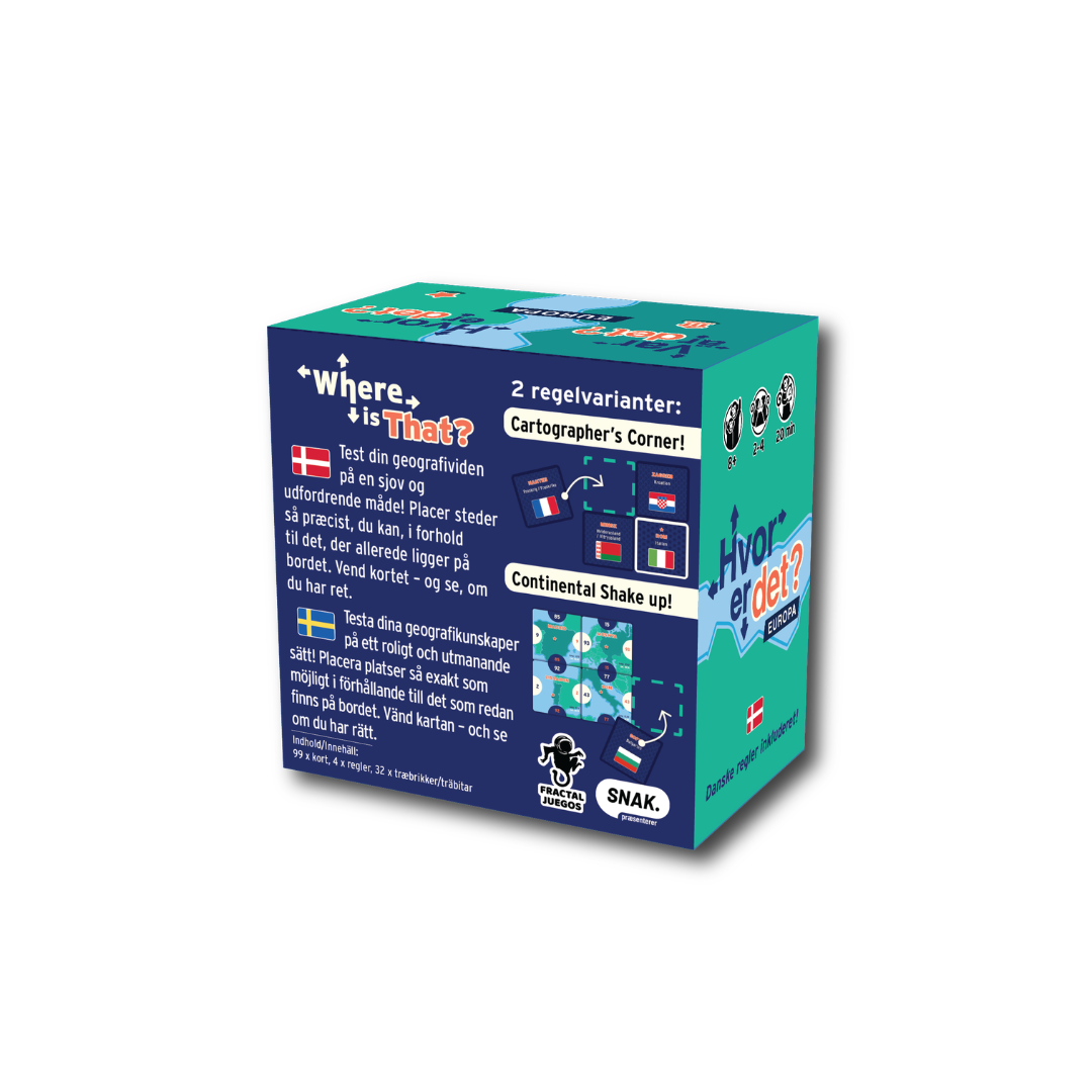 Test din viden om Europa og dens geografi på en sjov og udfordrende måde. Dette med den europæiske udgave af “Where Is That?”. Placér steder så præcist, du kan, der allerede ligger på bordet. Vend kortet – og se, om du har ret.