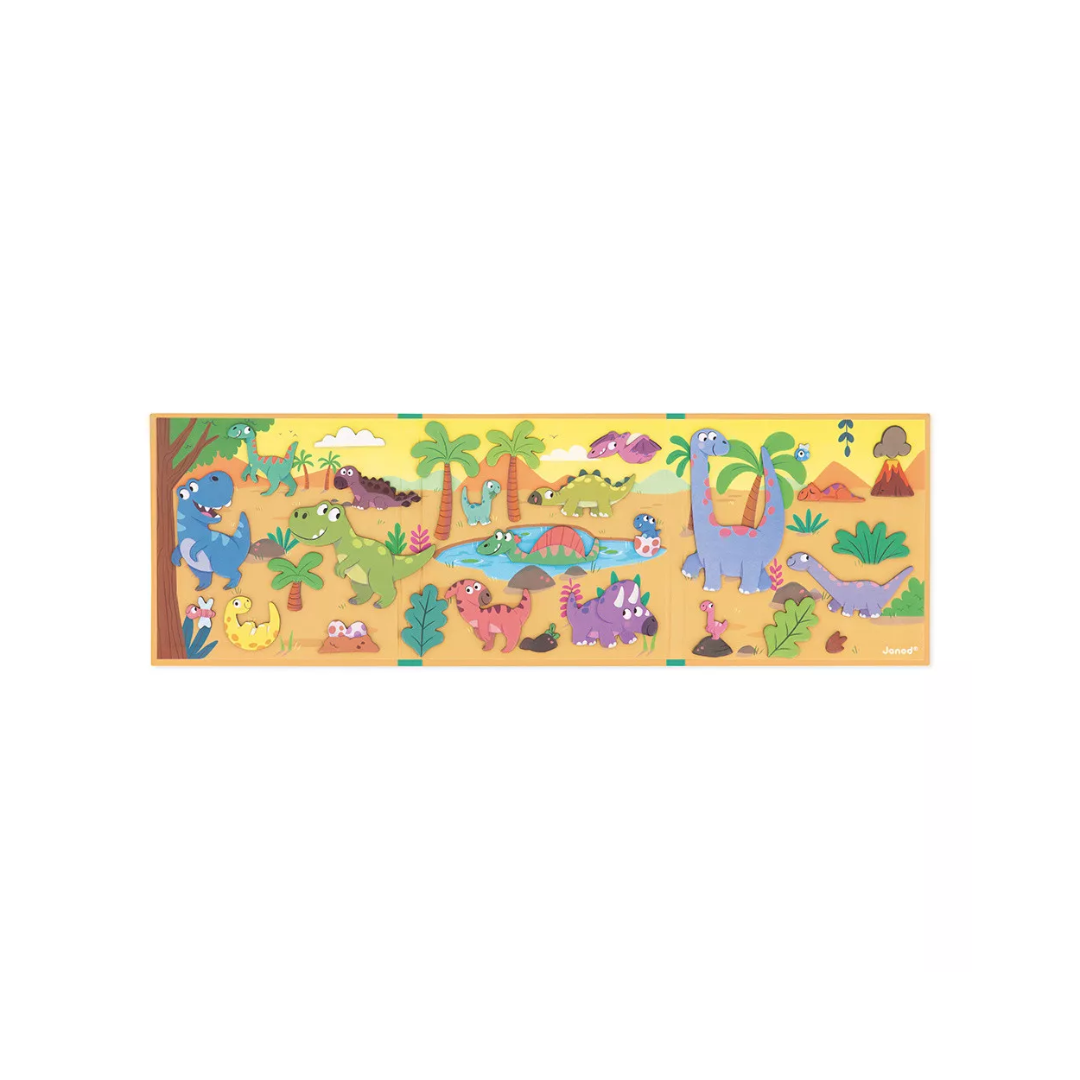 Sættet indeholder 30 farverige dinosaur-magneter, der gør legen levende og varieret. Barnet kan flytte rundt, kombinere figurer og opfinde nye historier igen og igen. Alt fra fredelige planteædere til spændende møder med store rovdinosaurer.
