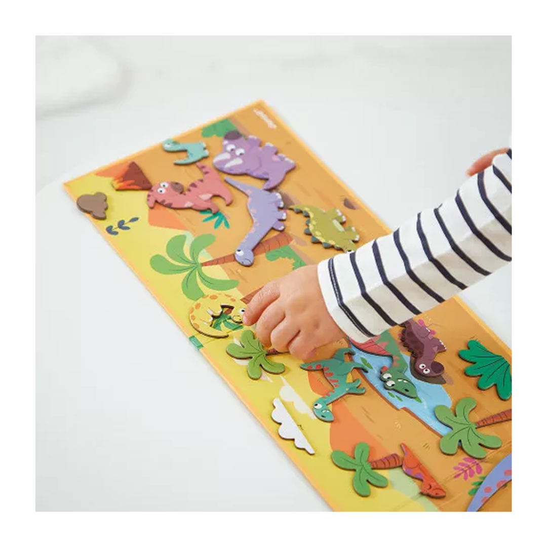 Tag på eventyr i dinosaurernes verden med “ROOAARR” magnetisk leg – et sjovt og kreativt magnetsæt, hvor barnet selv kan skabe sin helt egen urtidsfortælling. Den flotte, illustrerede baggrund fungerer som en magnetisk scene. Med de medfølgende magneter kan barnet placere dinosaurerne præcis, som ønskede.