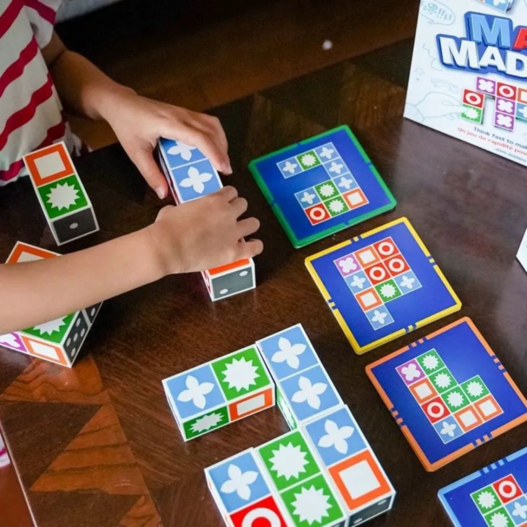 Match Madness er et tempofyldt familiespil, hvor hurtighed, overblik og præcision afgør, hvem der løber med sejren. Alle spillere starter med det samme sæt klodser. Når et mønsterkort vendes, gælder det om at være den første, der genskaber mønstret korrekt. Den hurtigste spiller vinder kortet – og scorer point.