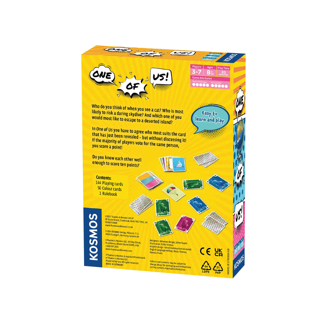 Spillet er hurtigt at lære og perfekt til både nye og gamle venner, familie, team-building eller som sjov icebreaker. Med 106 billedkort og 38 tekstkort byder One of Us på uendelig variation og masser af energi i hver runde. Kortene er også farveblindevenlige.