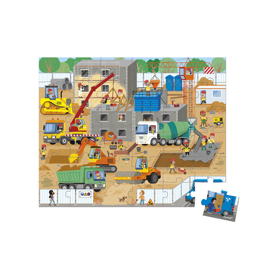 Det farverige motiv er fyldt med spændende detaljer fra byggepladsen, og barnet kan gå på opdagelse blandt maskiner, arbejdere og aktiviteter. Puslespillet hjælper samtidig med at styrke finmotorik, logisk tænkning, koncentration og tålmodighed.