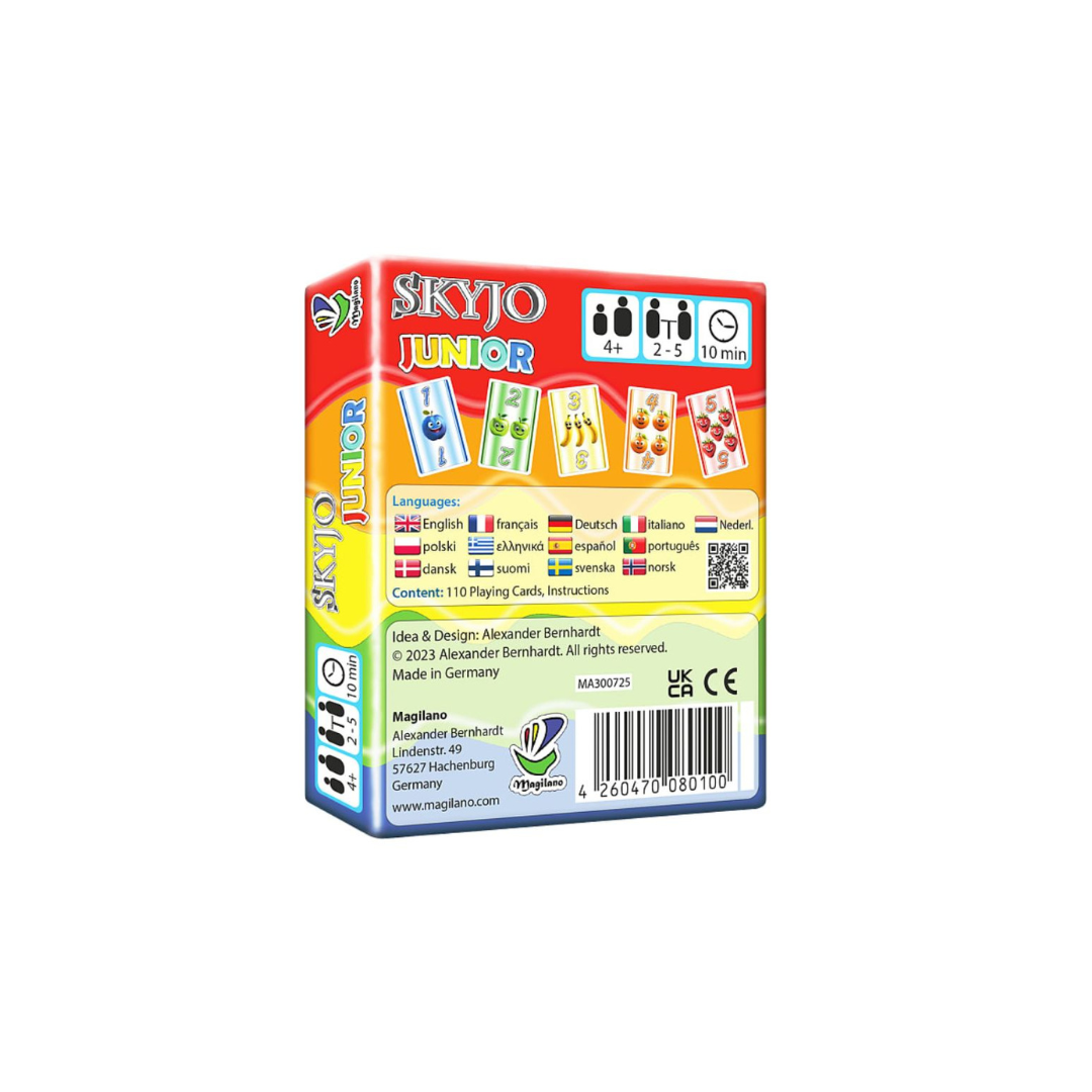Skyjo Junior er den børnevenlige udgave af det populære kortspil Skyjo. Hvor farverige frugter og simple tal gør det let for børn at være med. Spillet styrker talforståelse og introducerer børn til enkel strategi, samtidig med at det er underholdende og intuitivt. Kortene er helt uden tekst, hvilket gør spillet tilgængeligt for børn i alle aldre, mens de danske regler gør det nemt for voksne at forklare spillet. Den anbefalede alder er fra 4 år.