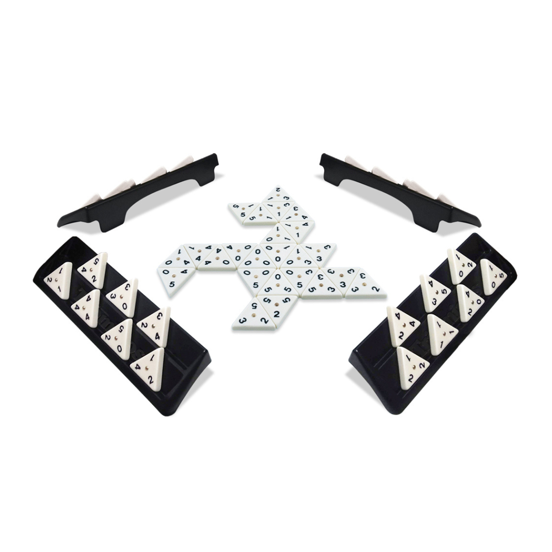 I Triominos mødes Domino og Rummikub, og resultatet er et taktisk og underholdende spil for hele familien. Alle brikkerne er trekantede, hvilket giver mange flere kombinationsmuligheder end klassisk domino. Med små “guldknapper” i midten er brikkerne lette at samle op fra bordet, og du kan lægge til tre sider eller bygge mønstre som broer og sekskanter for at få ekstra bonuspoint.